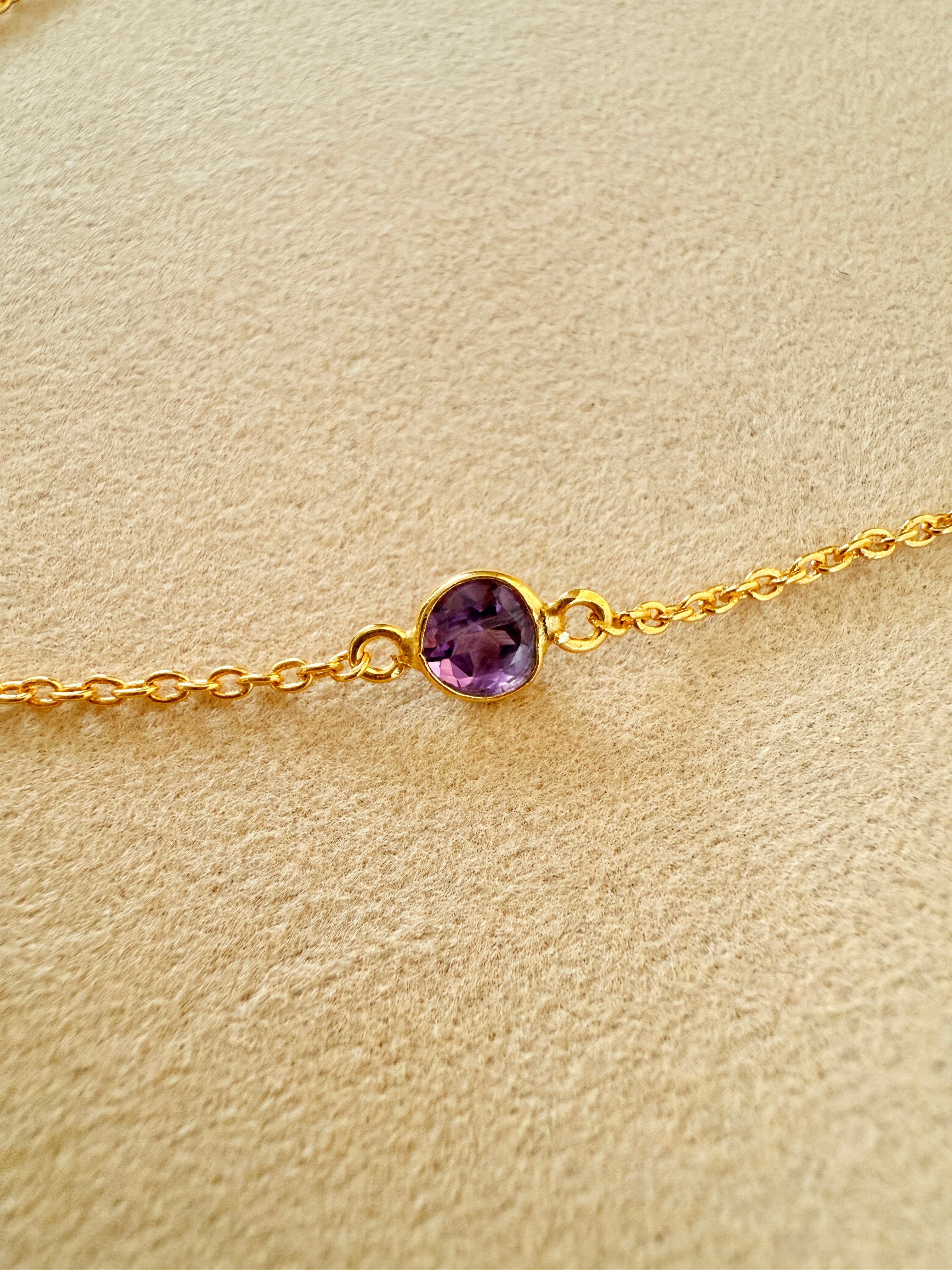 【Amethyst / アメシスト】 二月の誕生石。紫水晶。誠実な愛という石言葉をもち、ギリシャ神話ではワインを飲みすぎた神がアメシストになったとされているため、魔(酒)に酔わない石、魔除けになる石だといわれている。